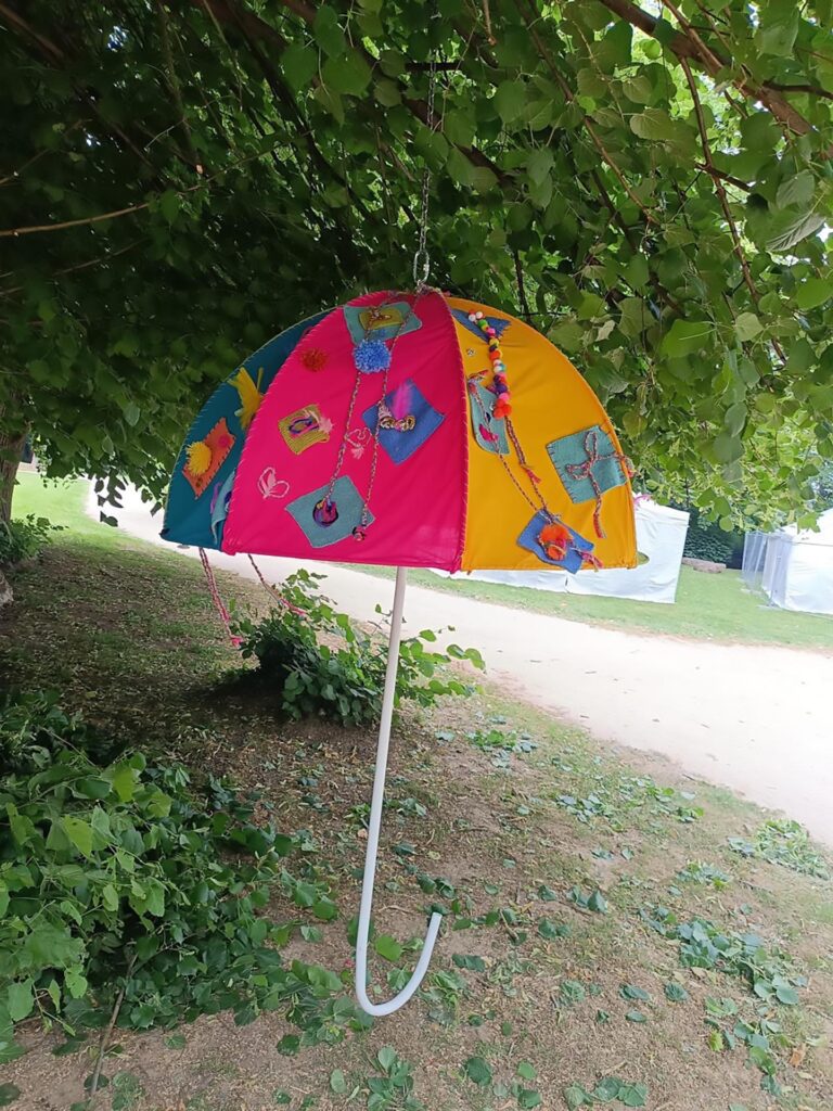 J’ai co-animé des ateliers autour de jeux sensibilisant à l’écologie, aux émotions et d’autres de tissage, tressage, tricot, pompon, couture, pour la création d’éléments fixés sur un grand parapluie, servant à une déambulation lors du Festival Divers et d’Eté à Clermont les 7 et 8 juin 2025.